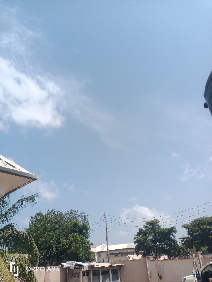 The image captures an outdoor, daytime scene within the city of Unknown, Unknown. The sky is predominantly clear and pale blue, featuring scattered white cumulus clouds. In the upper left quadrant, the white eave and dark brown gutter system of a building are partially visible, with several green palm fronds extending into the frame from the lower left corner. The top right corner shows a portion of a dark, cylindrical object, likely a water tank. The mid-ground is dominated by a dense canopy of multiple green trees. A wooden utility pole, equipped with several dark horizontal power lines, is positioned slightly left of center, extending diagonally towards the upper right. Behind the foliage and utility infrastructure, several light-colored buildings with white roofs are discernible. The lower section of the image features a light-colored, possibly tan or beige, perimeter wall, topped with what appears to be security spikes or barbed wire along its length. Below this wall, a series of smaller, weathered structures with corrugated metal roofs and closed blue-gray doors or gates are present. In the bottom right corner, a partial view of a white vehicle, possibly a car or van, is visible. No individuals are clearly identifiable or performing discernible actions within the depicted scene. The environment suggests an urban or semi-urban area under bright sunlight.