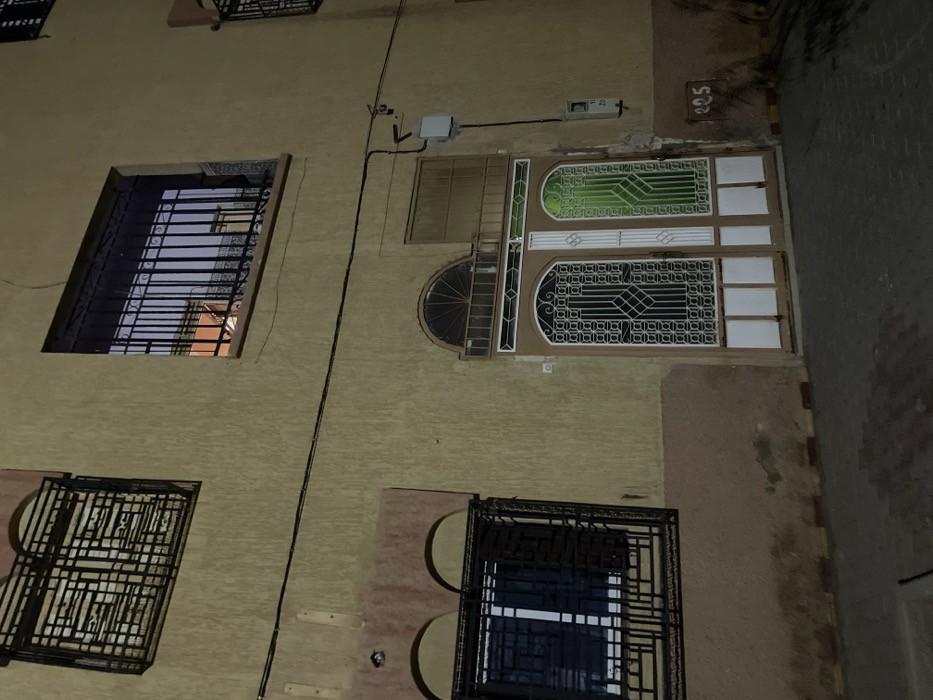 A tan building exterior is shot at night. The image is angled upwards. Windows with black grates are visible at various positions. Above a set of windows is the entrance, consisting of rectangular and arched components, with white and green panes. Electrical wires stretch across the building's surface.