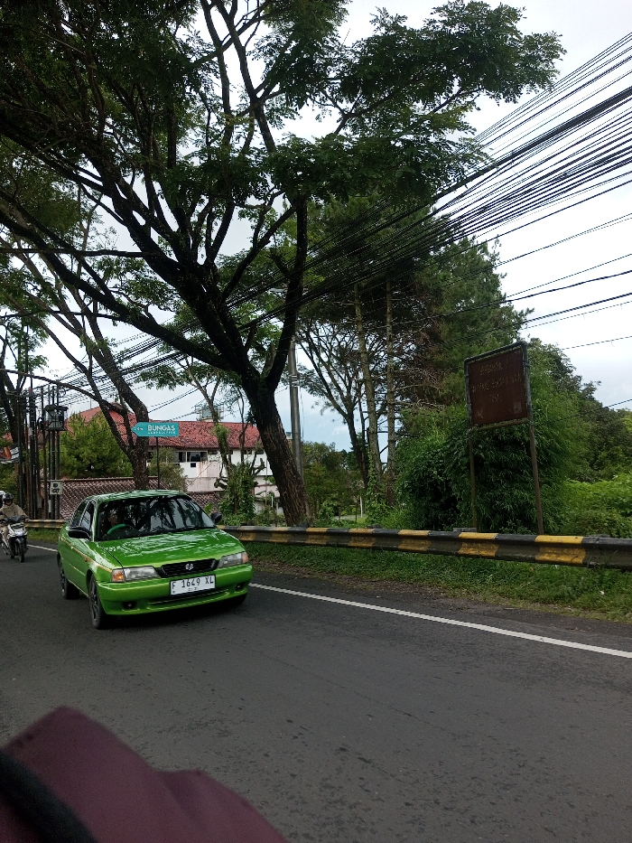 The image depicts a road scene in Pacet, Indonesia, specifically in the vicinity of the Bungas Hotel & Resort, as indicated by a sign on the left side of the road. The photograph is taken from a forward-moving perspective within a vehicle, with a blurred maroon object visible in the bottom-left foreground, likely part of the camera-operating vehicle's interior. The scene centers on a two-lane asphalt road under an overcast sky. A white dashed line separates the lanes. A prominent bright green Suzuki Baleno sedan, bearing Indonesian license plate "F 1649 XL," travels in the right lane, moving away from the camera. In the far-left background, a person on a white motorcycle, wearing a light-colored helmet and attire, is also traveling in the same direction. To the left of the road, a dense canopy of large, leafy trees with visible dark trunks and branches dominates the midground. Behind these trees, a multi-story building with a red tiled roof and white facade is partially visible. A light blue sign on a pole, displaying "BUNGAS HOTEL & RESORT," stands in front of this building. Numerous black power lines are strung horizontally across the upper portion of the frame, intersecting with the tree canopy and the sky. To the right of the road, a black and yellow striped metal guardrail runs parallel to the asphalt. Beyond the guardrail, there is a dense expanse of green vegetation, including several tall pine trees. A weathered, rectangular, rusty brown sign on a metal post is situated within this greenery, its text unreadable. The sky overhead is uniformly light gray, indicative of cloudy conditions.