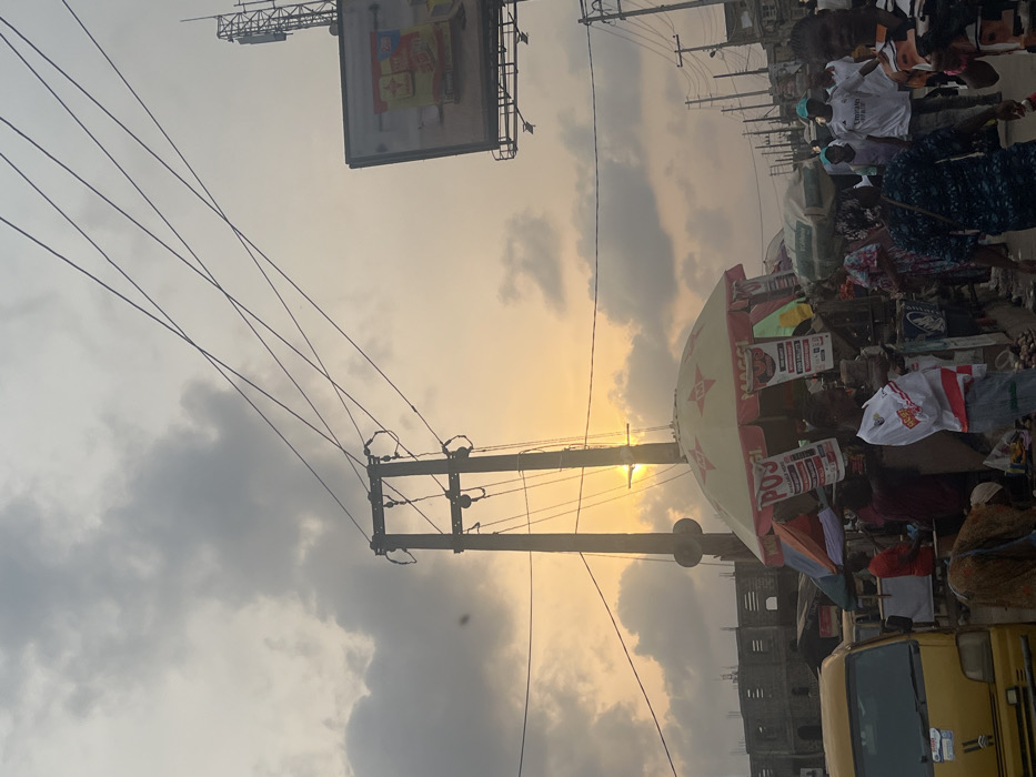 A bustling street scene under a cloudy, sunset sky. A billboard is visible in the upper left, and power lines crisscross the sky. People are gathered near a large, branded umbrella, likely a market stall. A yellow vehicle is parked in the foreground. The scene appears to be from a lively urban environment, possibly a market or commercial area.