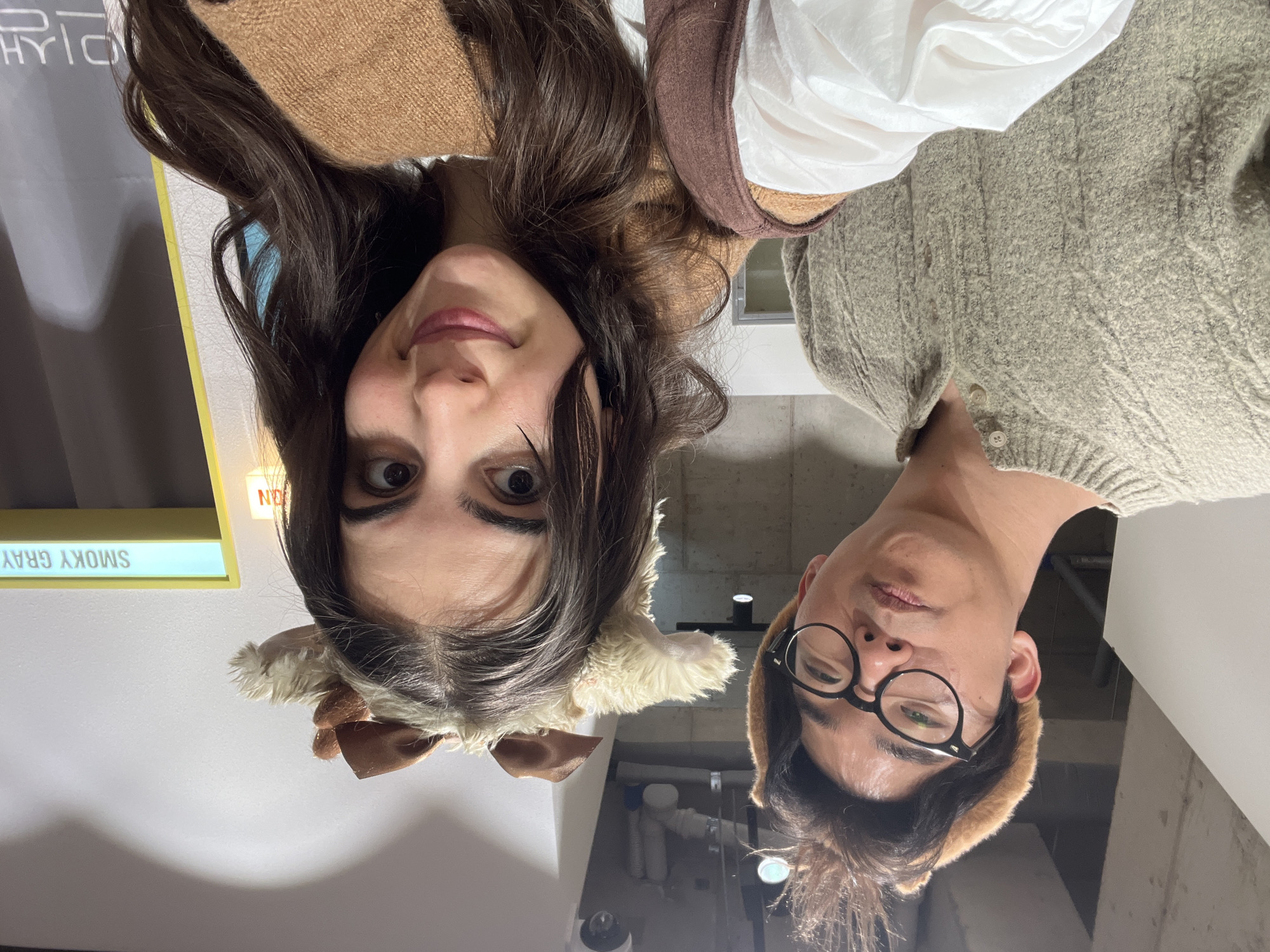 Two people are posing for a photo. The woman on the left has long brown hair and is wearing a brown and white animal ear headband. The man on the right is wearing glasses and a brown fuzzy hat. They both appear to be wearing sweaters. The photo was taken from above, looking down at them. Background details include a sign that says "SMOKY GRAY" and a partial view of a white wall with pipes. Based on the sign in the background, this is likely taken inside the "Smoky Gray" bar located in Daegu, South Korea.