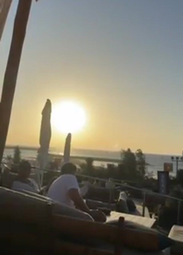 beachside scene at sunset. In the foreground, there are wooden lounge chairs with cushions, partially under a fabric awning supported by wooden poles. Two men are sitting on the chairs, silhouetted against the setting sun. Beyond them, there's a view of the ocean, a beach, and some vegetation. White closed umbrellas are interspersed between the people and the water. A sign with the word "ACAI" is visible. The sun is a bright circle in the sky, partially obscured by the umbrellas. The sky is a light blue gradient, fading to a hazy orange near the horizon. People are scattered throughout the scene in various states of relaxation.
