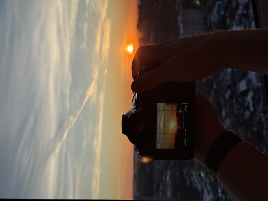 A high-angle, eye-level perspective captures a sunset over the city of Perm, Russia. The central subject is a black DSLR camera, held by a person's hands and forearms. The person's left forearm is visible, adorned with a dark wristband. The camera's illuminated LCD screen displays a live view of the identical sunset scene, overlaid with a grid and a histogram. Visible camera settings include "M" (Manual mode), "1/1000" shutter speed, "F5.0" aperture, and "ISO 100." Beyond the camera, the actual scene shows a vibrant orange sun positioned slightly right of center, just above the distant urban horizon. The sky transitions from light blue at the zenith to intense orange and yellow near the horizon, featuring scattered wispy clouds and a prominent white contrail traversing from the upper left towards the middle right. The distant cityscape of Perm appears as a dark silhouette against the luminous sky. Below the silhouetted buildings, the ground is partially visible, presenting a snow-covered landscape, indicative of a cold weather environment.