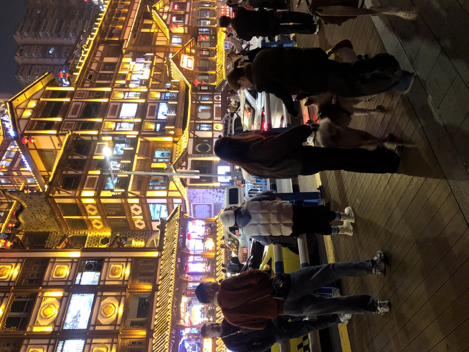 This image captures a nighttime urban scene in 江北城街道, China. The background is dominated by multi-story commercial buildings exhibiting traditional Chinese architectural features, including tiered roofs, dark timber frames, and ornate window patterns. These structures are extensively illuminated with warm yellow and orange lights. Red lanterns are visible on some lower levels. A modern high-rise building is partially visible in the upper right background, behind the traditional architecture. In the foreground and mid-ground, approximately eight individuals are standing on a dark wooden boardwalk. A dark metal barrier separates this boardwalk from a multi-lane road, where several vehicles, including a yellow-accented sedan and other cars, are observed. A bright white streetlamp is positioned in the mid-ground. From left to right in the foreground: - A male figure with a beard wears a dark t-shirt and dark pants. - Next to him, a second male figure, viewed from behind, wears an orange-brown long-sleeved shirt, blue jeans, and light-colored athletic shoes, carrying a small black shoulder bag with a gold chain strap. - Further right, a person (gender indistinct) is seen from the back, wearing a white puffer vest, a white beanie, dark pants, and white boots. - Adjacent, a woman with long dark hair, wearing a dark jacket and dark pants, holds a leash attached to a light brown, medium-sized dog wearing a harness. - A fifth individual in a dark jacket and dark pants, wearing blue and white athletic shoes, is positioned near the woman and dog. - Additional indistinct human figures are visible on the boardwalk and near the road further in the background. - A large brown bag or backpack is partially visible on the far right edge of the frame. The individuals are primarily stationary, observing the illuminated environment, with one person tending to the leashed dog.