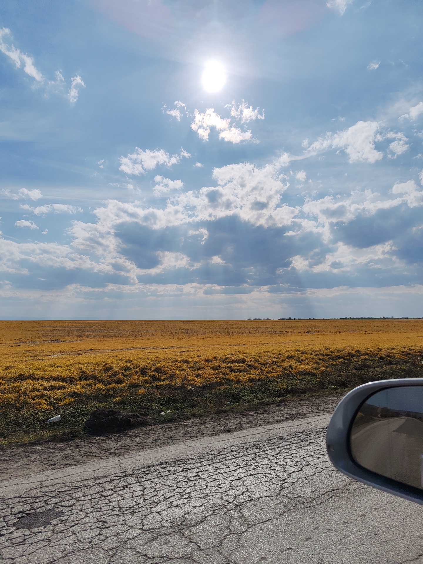 The image displays a rural landscape near Sofronievo, Bulgaria, observed from a moving vehicle. The scene is dominated by a bright, partly cloudy sky, with the sun prominently positioned in the upper center, emitting visible rays through scattered cumulus and stratocumulus clouds. Below the horizon, a vast, flat agricultural field stretches across the middle and background, covered in golden-yellow stubble or dried vegetation, extending to a faint line of trees or structures in the far distance. In the immediate foreground, a heavily cracked and weathered asphalt road surface occupies the left and bottom portions of the frame. Adjacent to the road, a narrow strip of dark soil and sparse green vegetation contains discarded litter, including two white plastic bottles and a dark clump of debris. The lower right corner of the image captures the dark grey casing of a vehicle's side mirror, which reflects a portion of the road behind the vehicle.