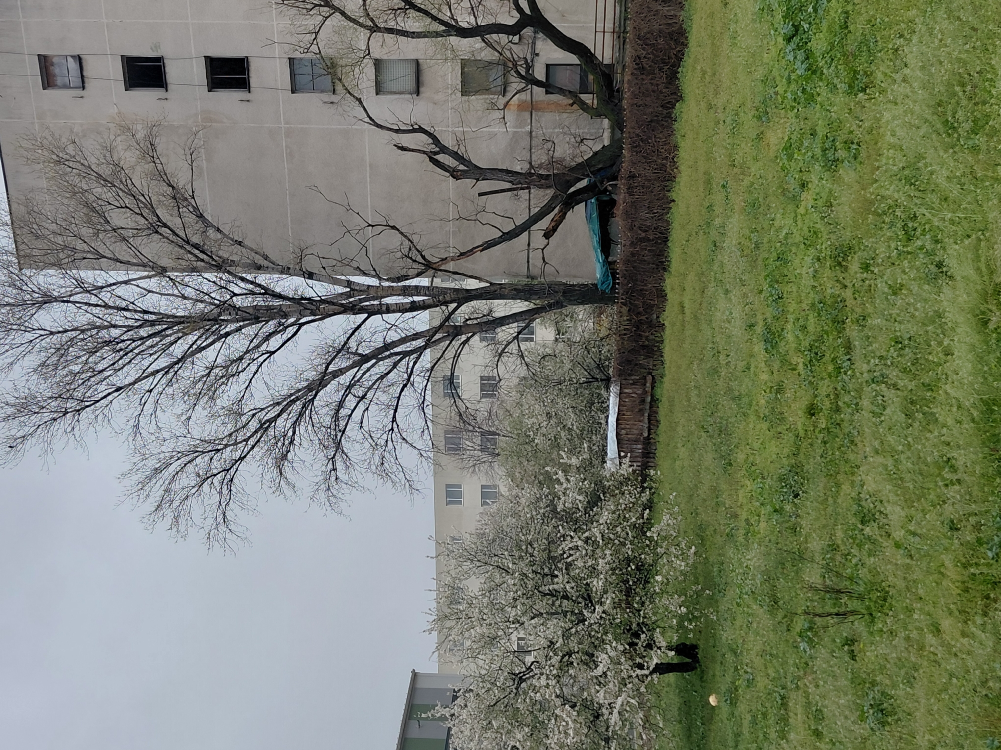 n exterior view in Pazardzhik, Bulgaria, featuring a gray, multi-story building with dark windows, contrasted by a bare tree with intricate branching in the foreground. Adjacent to the building, a well-maintained hedge separates it from a green, grassy area, blending into the foliage. Closer to the viewer, a flowering tree adds brightness to the scene, contrasting against the overcast sky.