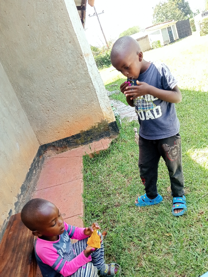 The image displays an outdoor scene in Lumakanda ward, Kenya, under bright daylight. Two young male children are present. The child on the right stands on green grass, wearing a dark grey t-shirt with "FUTURE SQUAD" text, dark trousers, and blue sandals. He holds a small, pink object near his mouth. The child on the left is seated on a wooden bench, wearing a pink and grey long-sleeved shirt, striped trousers, and dark sandals. This child holds a triangular, orange object in both hands. A light-colored concrete wall with a dark base occupies the left foreground, adjacent to a narrow reddish paved path. In the background, green foliage, a utility pole, and distant single-story buildings are visible under clear skies.