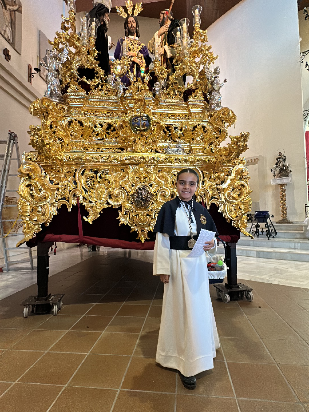 A full, indoor shot shows a young girl standing in front of a large, ornate golden float in what appears to be a church or religious building, likely in Jerez de la Frontera, Spain. The girl is dressed in a long, white robe with black trim, a black cape, and black shoes. She wears a white rope belt with a large medal. She holds papers in one hand and smiles at the camera. Behind her is a large, golden float with intricate carvings and religious statues. It is mounted on casters for mobility. The statues on top depict religious figures. The background features the interior of a church with marble flooring, whitewashed walls, and religious sculptures. A ladder leans against the wall on the left side of the photo.