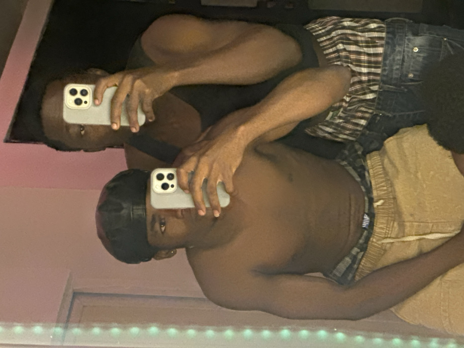 A shirtless man with a black durag takes a mirror selfie using a smartphone. The reflection reveals another man in a black tank top. Both are dark-skinned. The man with the durag wears tan drawstring pants. The other man wears plaid boxer shorts and denim jeans. Only the corner of another person with curly dark hair is visible. The background includes a door and possibly LED lights.
