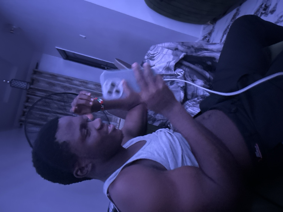 A person lies on a bed, illuminated by a blue light, holding a phone in their hands. They wear a white tank top and black pants. A charging cable is connected to the phone. Visible in the background are bedsheets with a marbled pattern, a fan, and a window. The person has a bracelet on their wrist and appears to be smiling.