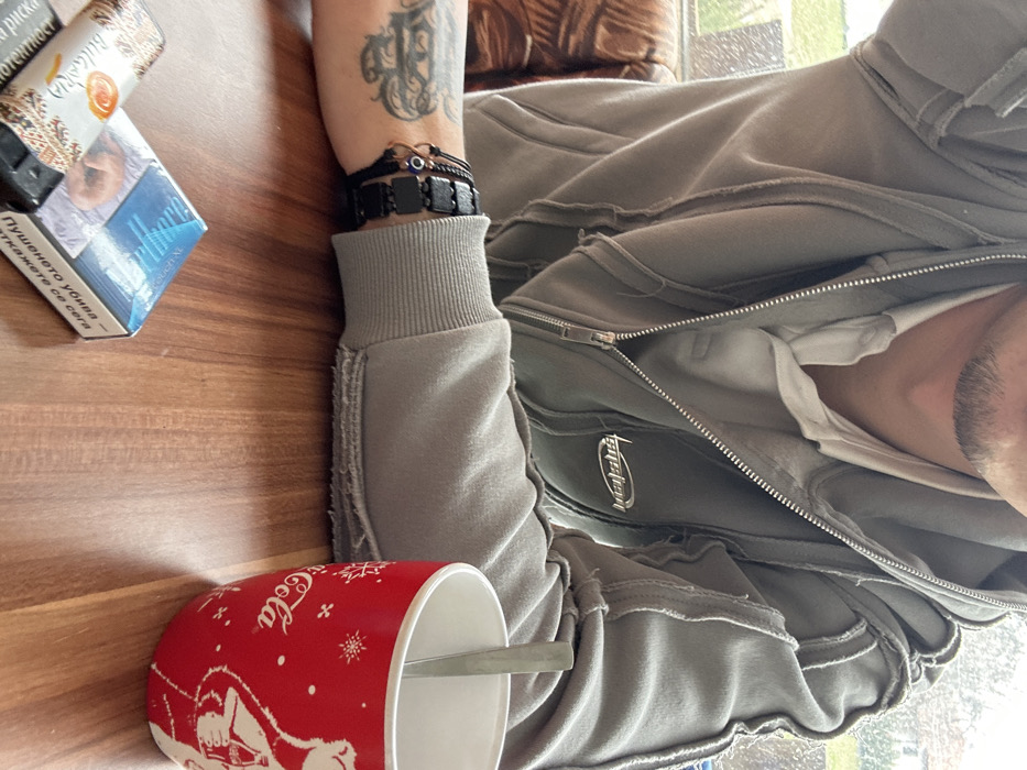 A male individual is observed from the chest down, seated at a wooden table in an indoor setting identified as Priseltsi, Bulgaria. He wears a light-colored polo shirt under a grey full-zip hooded sweatshirt with distressed seams and a silver "system" emblem on the left chest. His left forearm, bearing a black-ink tattoo of an abstract design, rests on the table. Multiple black bracelets, including a beaded design and a cord with a blue "evil eye" bead, are worn on his left wrist. On the table, to the right, is a red ceramic Coca-Cola mug with a polar bear motif and a silver spoon inside. To the left, a blue and white pack of "Victory" cigarettes with Cyrillic text, including a health warning, and a partially visible lighter adorned with a "Bulgarka" inscription and traditional patterns are present. Through a window in the blurred background, green foliage and a distant structure are visible, indicating an outdoor view during daylight.