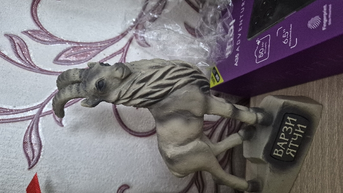 The scene depicts an indoor environment, specifically a room in Kamennyi Kliuch, Russia. A light gray-beige statuette of an ibex or mountain goat, featuring detailed horns and a textured mane, stands prominently in the left-center of the frame. The statuette rests on a rock-like base, which has a black plaque inscribed with white Cyrillic text: "ВАРЗИ ЯТЧИ". To the right, a purple cardboard box, identified as "A36 ADVENTURE" and displaying icons for "50 MP," "6.5''," and a fingerprint sensor, is partially visible, tilted on its side. Clear, crinkled plastic packaging material is present behind the box. The background consists of a light-colored wall covered with wallpaper featuring reddish-purple, glittering floral or vine patterns. A small red triangular object is partially visible in the upper left corner. All objects are positioned on a brown, wood-grained horizontal surface. No individuals or active interactions are observed within the frame.