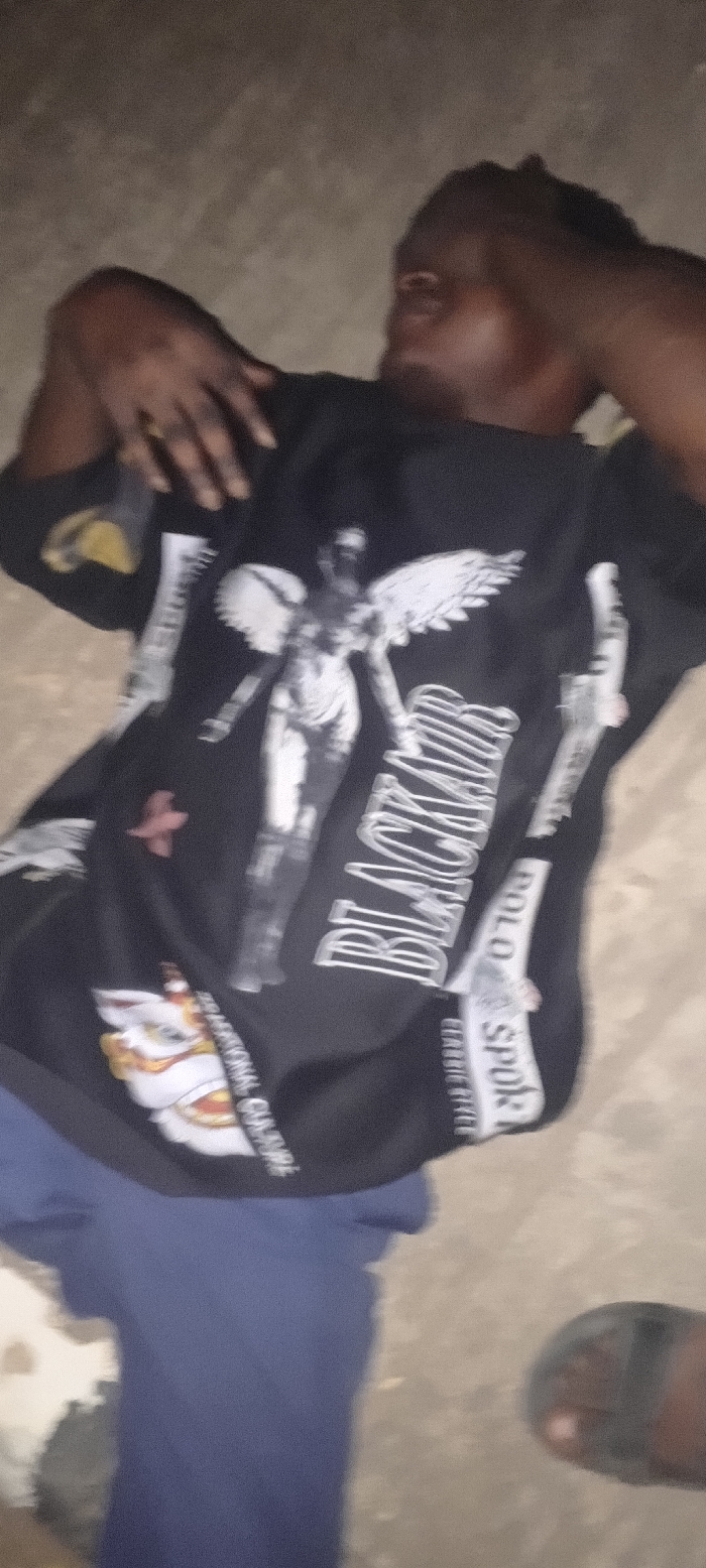 A person lying on the ground wears a dark t-shirt featuring a winged figure, possibly an angel, along with text and graphic prints. The person's hands are raised near their face. Blue pants and part of a sandal are also visible. The ground appears to be a rough, textured surface. The image is slightly blurry and lacks clear focus.