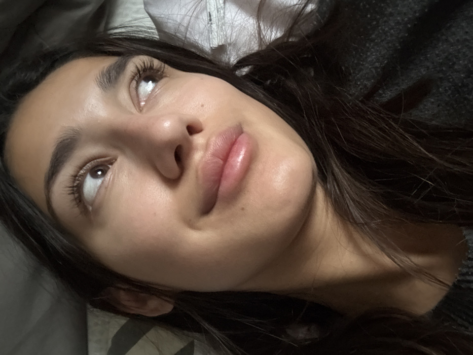 A young woman with dark brown hair is lying down, gazing upwards with her brown eyes