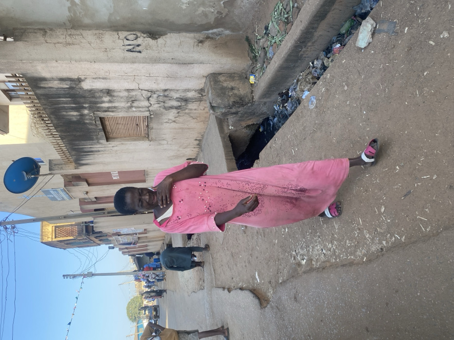 The image captures a street scene in Kakuri Gwari, Nigeria, under a clear blue sky. In the foreground, an adult female with dark skin, short dark hair, and an apparent expression of discomfort or distress, walks towards the viewer's right. She is wearing a long-sleeved, loose-fitting pink garment, possibly a dress or kaftan, adorned with light-colored embellishments on the chest, and pink and white slide sandals. Her right hand is raised, partially covering her mouth and chin. To the right of the woman, an open concrete drainage channel runs parallel to an unpaved pathway. This channel contains dark liquid and various forms of refuse, including plastic debris and organic matter. Beyond the channel is a weathered, light-colored building facade exhibiting cracks and dark discoloration. A window opening with a closed brown slatted shutter is visible on this wall, along with the black spray-painted letters "NO" in the upper right section. A blue satellite dish is mounted high on the building, and barbed wire fencing tops an adjacent wall. The unpaved roadway continues into the background on the left. Several other individuals are visible in the distance, including one person in a dark green garment in a bent or kneeling posture on the road. Additional buildings, including multi-story structures, line the street in the background. Numerous overhead utility lines and a string of multicolored triangular flags (bunting) are also present.