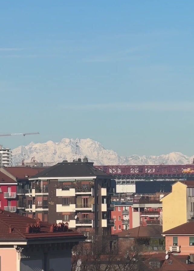The video pans across an urban landscape, revealing rooftops of multi-story buildings under a clear, blue sky. In the distance, a range of snow-capped mountains forms a striking backdrop. Structures such as a red bridge and construction cranes punctuate the skyline. Various architectural styles are visible, from traditional tiled roofs to modern facades, amidst sparse winter foliage.