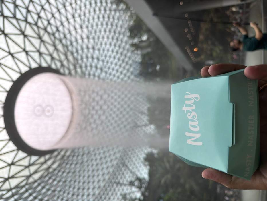 A light-skinned hand holds a hexagonal light-blue cardboard box in the foreground. The box displays "Nasty" in white script on its top surface, and "NASTY . NASTIER . NASTIE" is partially visible along its lower edge. The background features the HSBC Rain Vortex, a large cylindrical indoor waterfall, descending from a circular opening within a vast glass and steel geodesic dome at Jewel Changi Airport, Singapore. A blurry "8" or "00" is faintly visible within the upper structure of the waterfall. Lush green vegetation is present around the base of the waterfall. In the lower-right background, a male in a dark green t-shirt stands, holding an open black umbrella and looking upwards. Additional blurred figures are discernible in the distant background, and a dark, multi-level architectural structure with diffused lights is visible on the right.