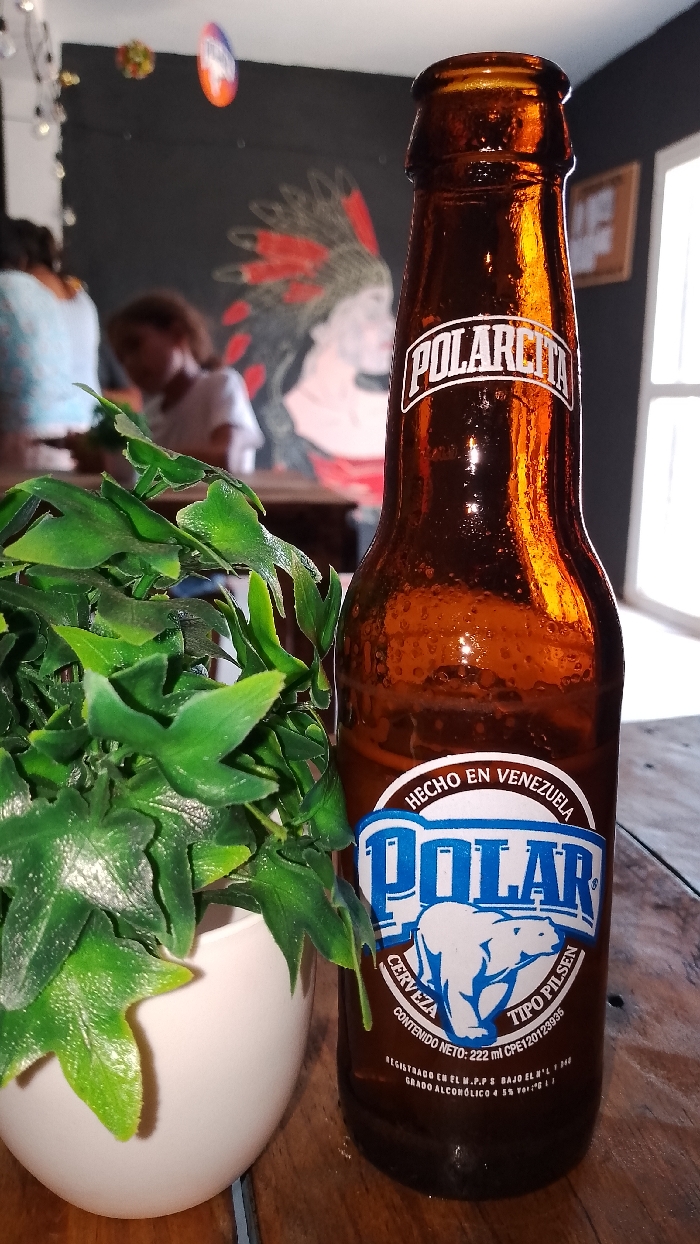 A brown glass beer bottle with "Polarcita" printed on the neck and a "Polar" logo featuring a polar bear on the label. The label also reads "Hecho en Venezuela," "Cerveza Tipo Pilsen," and mentions a net content of 222 ml. The bottle is next to a small white pot with green leaves. In the blurred background, there's a mural of a person wearing a feathered headdress, a circular sign, and glimpses of other people in a room. The surface is wooden.