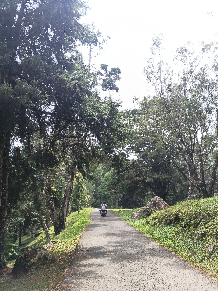 A paved road cuts through a lush green landscape with dense trees. A person is riding a small motorcycle away from the viewer, going down the path. The roadside is covered with grass and a few scattered rocks. Trees dominate both sides, casting shadows on the road. The sky above is overcast and muted.
