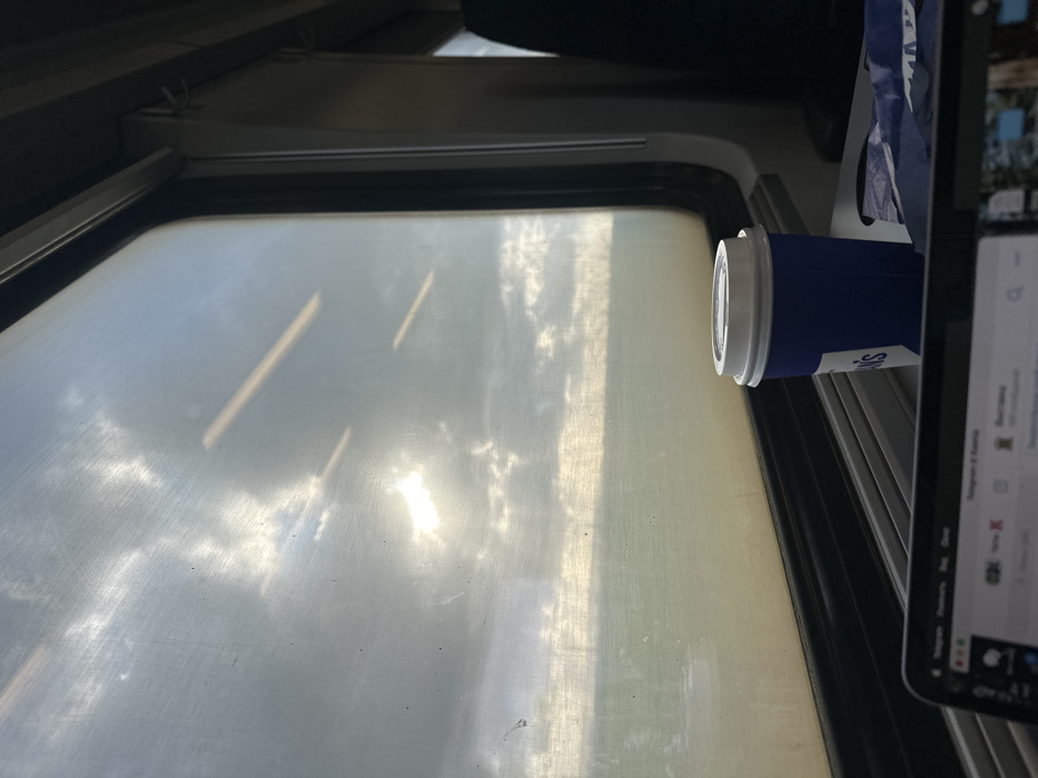 The image captures a view from inside a train carriage, looking out a window, with the scene located within the Misgav Regional Council, Israel. The exterior view through the train window shows an overcast sky, with the sun brightly illuminating a break in the clouds in the upper-left portion of the frame, causing a significant glare on the window surface. Below a flat, distant horizon line, a smooth, light-green or beige expanse extends, consistent with a large body of water or flat land. Reflections of two horizontal interior light strips are visible on the window glass. Inside the train, on a tray table positioned beneath the window in the mid-right foreground, a blue disposable coffee cup with a white lid is present. The cup bears partially visible white branding, reading "Rami's". To the right of the cup, a crumpled blue and white paper item rests on the table. In the immediate foreground, the lower section of an active laptop screen is visible, displaying a web browser with multiple tabs, including a clear icon for 'Telegram'. A portion of a dark-colored train seat is visible on the far right side of the frame. No individuals are depicted in the scene.