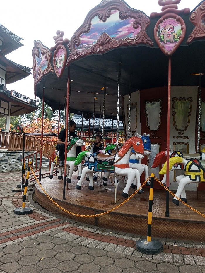 A colorful carousel with painted horses is the main subject. A man and a child ride the carousel, which features mirrors on its inner panels and decorative paintings along the top. The carousel is surrounded by a chain barrier supported by black and yellow striped poles. Brick pathways and a building with a tiered roof are visible in the background, suggesting an outdoor amusement park setting. The overall scene is somewhat overcast.
