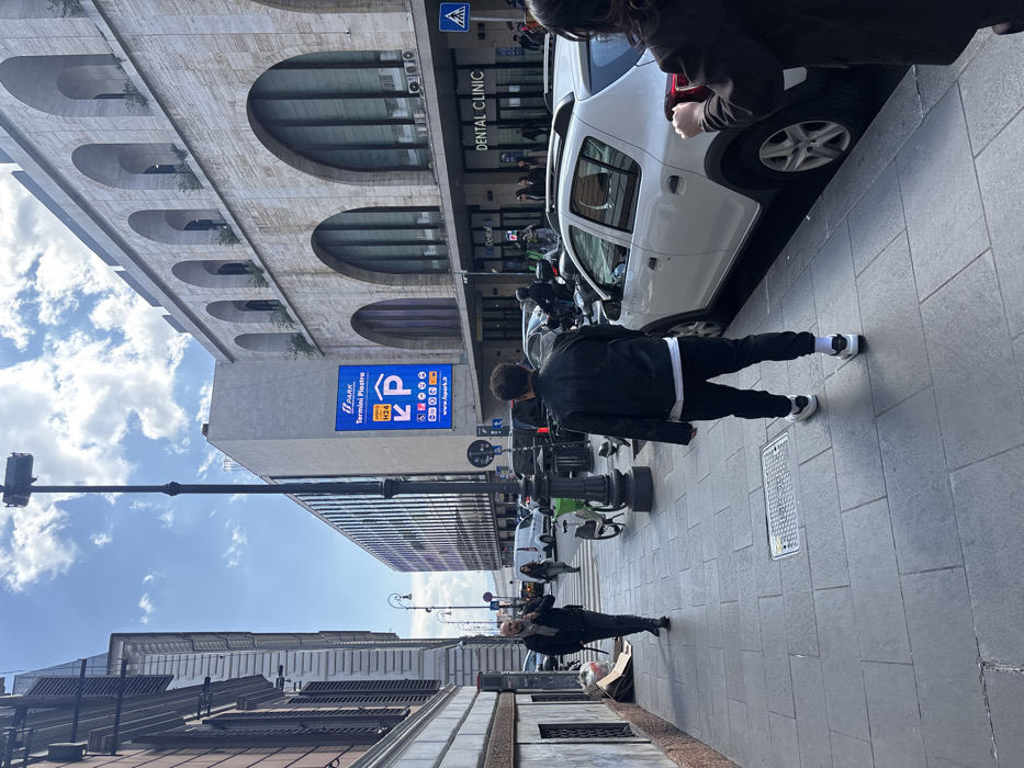 This image captures an urban street scene near Roma Termini railway station in Rome, Italy, under daylight conditions with a partly cloudy sky. In the foreground and midground, a male subject is observed from behind, walking away from the camera on a grey tiled sidewalk. He wears a black leather jacket, black pants, a white t-shirt, white socks, and white sneakers with black accents. To his immediate right, a white Dacia Sandero Stepway SUV is parked facing away from the camera, along a street lined with other parked vehicles. The right edge of the frame shows the arm and back of another person, facing away from the camera, wearing a dark garment. Further down the sidewalk on the left, another male subject with a beard walks towards the camera, wearing a dark jacket and a light-colored scarf, holding an object in his left hand. A tall, black street lamp pole stands centrally in the midground, dividing the scene. Beyond it, a busy street is visible with moving and parked vehicles, including what appears to be a green public bicycle (Jump bike) parked on the sidewalk. The background features several prominent buildings. On the right, a large, light-colored stone building with multiple arched windows and decorative elements, consistent with the architecture of Roma Termini station, houses a "DENTAL CLINIC" on its ground level. A large blue digital sign, bearing the Trenitalia logo and "Termini Piastro," indicates a parking facility. On the left, a multi-story building with classical architectural features and shuttered windows lines the sidewalk. In the distant center, a modern building with a dark, reflective facade is visible. Pedestrians are dispersed throughout the scene, walking on sidewalks and near businesses.