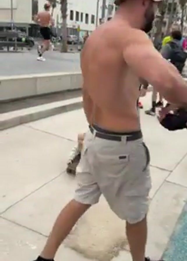 A shirtless man in a bucket hat high-fives someone as a baby lies on a skateboard, crawling on it, on a city sidewalk. The man in black bends over to give the baby a push. People pass by in the background. Buildings and palm trees are also visible. The sidewalk is a mix of concrete and an area of blue and white tiling.