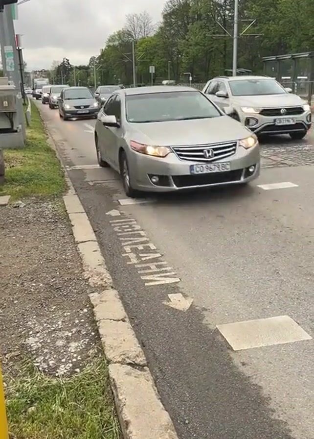 cars driving on a street on a cloudy day. The camera is positioned on the sidewalk, showing the edge of the road with painted markings indicating a pedestrian crossing. Various cars, including a silver Honda, a gray Skoda, and a silver Ford Kuga, drive past. In the background, there are trees, overhead tram lines, and a bus stop. The traffic appears to be moderate. The video focuses on the cars crossing the designated pedestrian pathway on the road.