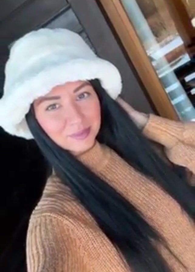 woman posing for the camera. She is wearing a tan sweater and a white, furry bucket hat. She has long, dark hair. She is smiling slightly. Behind her is a wooden wall and a window.