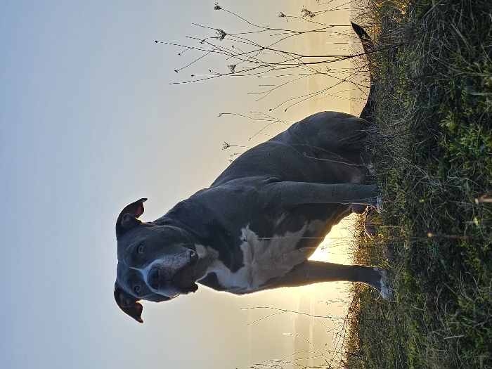 - "A gray and white pit bull dog sits among green grass and bare, wispy weeds" by FM-n22Rc2, licensed under CC BY 4.0