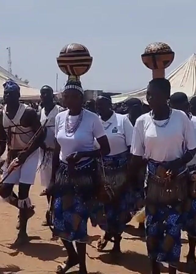 Here's a forensic description of the video: **Scene:** The video depicts a cultural event taking place in an open, dusty area under a clear, sunny sky. In the background, there are large, white tents and a gathering of people. A distant mountain is visible. **People:** The main focus is a group of people parading or dancing. These individuals are dark-skinned, many wearing white t-shirts and distinctive traditional attire. Some of the men are dressed in traditional hunting clothes with bows and arrows, some of the women have intricate objects balanced on their heads, and others are wearing skirts with blue patterns. There is a large crowd of onlookers present, some wearing blue and white clothing. **Actions:** The primary action is the procession of people walking and dancing together. The people in the foreground are moving towards the camera. The crowd is observing the procession. **Objects:** The scene includes white tents, traditional clothing and accessories (bows, arrows, skirts, head ornaments), and miscellaneous objects carried by some of the participants. The environment is characterized by a sandy or dusty ground.