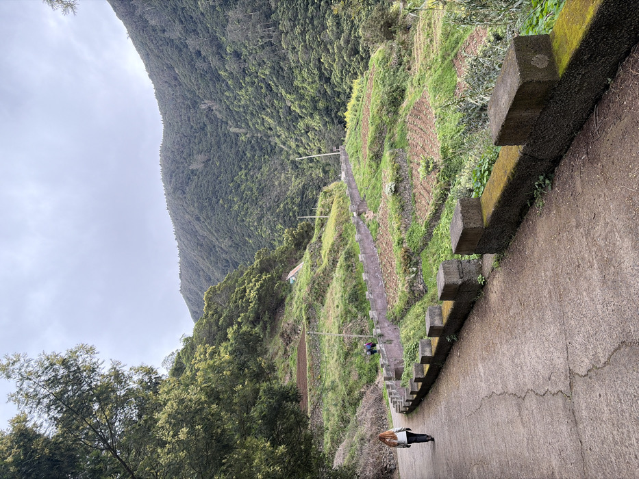 The image displays a steep, terraced mountain valley landscape in Machico, Portugal, under an overcast sky. A paved path, appearing to be concrete or asphalt, ascends from the foreground, curving gently to the left and then to the right into the distance. In the immediate foreground on the left, a person with long, reddish-brown hair, wearing a light-colored jacket and dark pants, walks away from the camera along the path. To the right of the path, a low concrete retaining wall runs parallel, topped with regularly spaced rectangular concrete blocks, some showing green moss growth. Beyond this wall and further up the hillside, numerous agricultural terraces are evident. These terraces feature dark, cultivated soil patches and areas of sparse green vegetation, supported by stone retaining walls. A longer, light pinkish-grey concrete retaining wall, also topped with square blocks, borders a higher section of the path as it continues to ascend. Two additional figures, dressed in darker clothing, are visible walking on this upper section of the path, moving away from the viewer. The background is dominated by steep, verdant mountain slopes densely covered in green trees and vegetation, forming a deep valley. Several thin, light-colored utility poles are visible extending vertically from the hillside. A small, rust-colored corrugated metal structure is perched on a higher terrace to the left of the main path. Tall trees with green foliage are present on the left side of the frame, partially obscuring the upper left portion of the view.