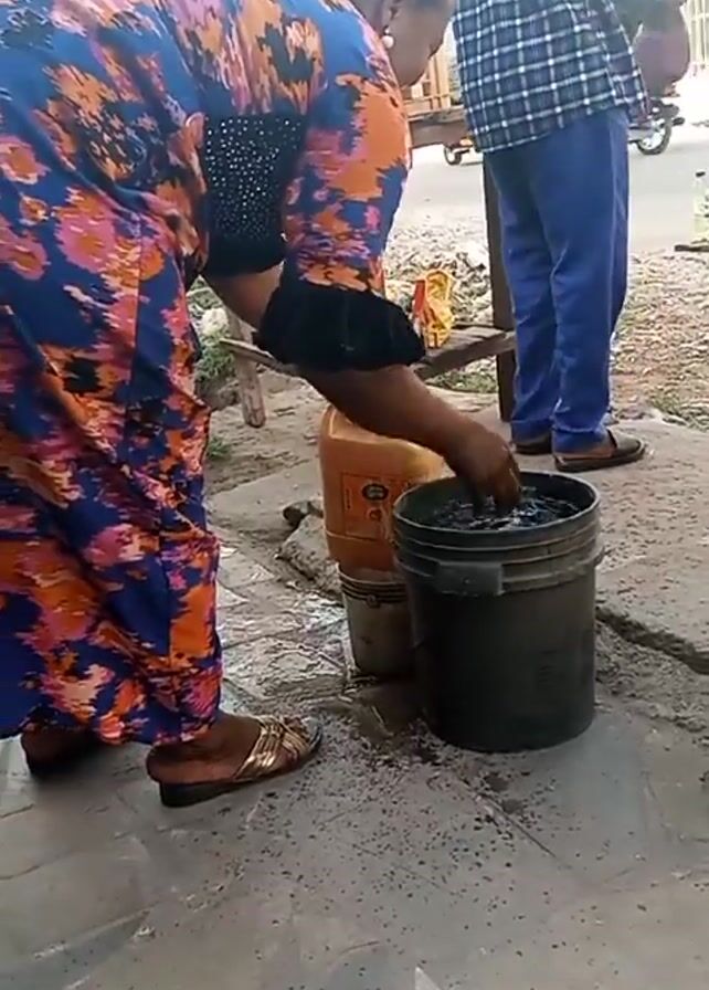 A woman is pouring liquid from a yellow plastic container into a black bucket. She's wearing a long dress with a blue, orange and pink floral pattern. She also has on gold-colored sandals. Beside her and slightly behind is a man wearing a plaid shirt and blue pants, with brown sandals. They are standing on a cement surface that appears to be a sidewalk or pavement. Behind them is a wooden table and a street with vehicles in the distance. The woman is carefully pouring the liquid, and some of it spills around the bucket.