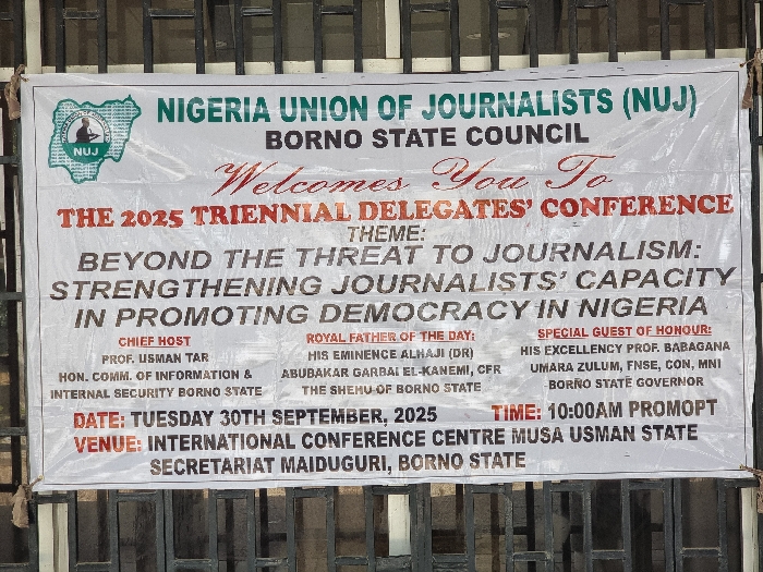 A rectangular white banner is prominently displayed, affixed to a dark metal grate or barred window, likely outdoors, at the International Conference Centre Musa Usman State Secretariat in Maiduguri, Borno State, Nigeria. The banner, featuring green, red, and black text, advertises "The 2025 Triennial Delegates' Conference" of the "Nigeria Union of Journalists (NUJ) Borno State Council." A green circular NUJ logo is visible on the upper left. The conference theme is "Beyond the Threat to Journalism: Strengthening Journalists' Capacity in Promoting Democracy in Nigeria." The event is scheduled for Tuesday, September 30th, 2025, at 10:00 AM. Mentioned participants include Chief Host Prof. Usman Tar (Hon. Comm. of Information & Internal Security Borno State), Royal Father of the Day His Eminence Alhaji (Dr) Abubakar Garbai El-Kanemi, CFR (The Shehu of Borno State), and Special Guest of Honour His Excellency Prof. Babagana Umara Zulum, FNSE, CON, MNI (Borno State Governor). No individuals are physically depicted in the image.
