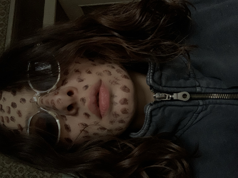 A person wearing clear glasses lies on their side. They have brown hair and are wearing a gray hoodie with a zipper. Brown spots cover their face. The photo is slightly dark.