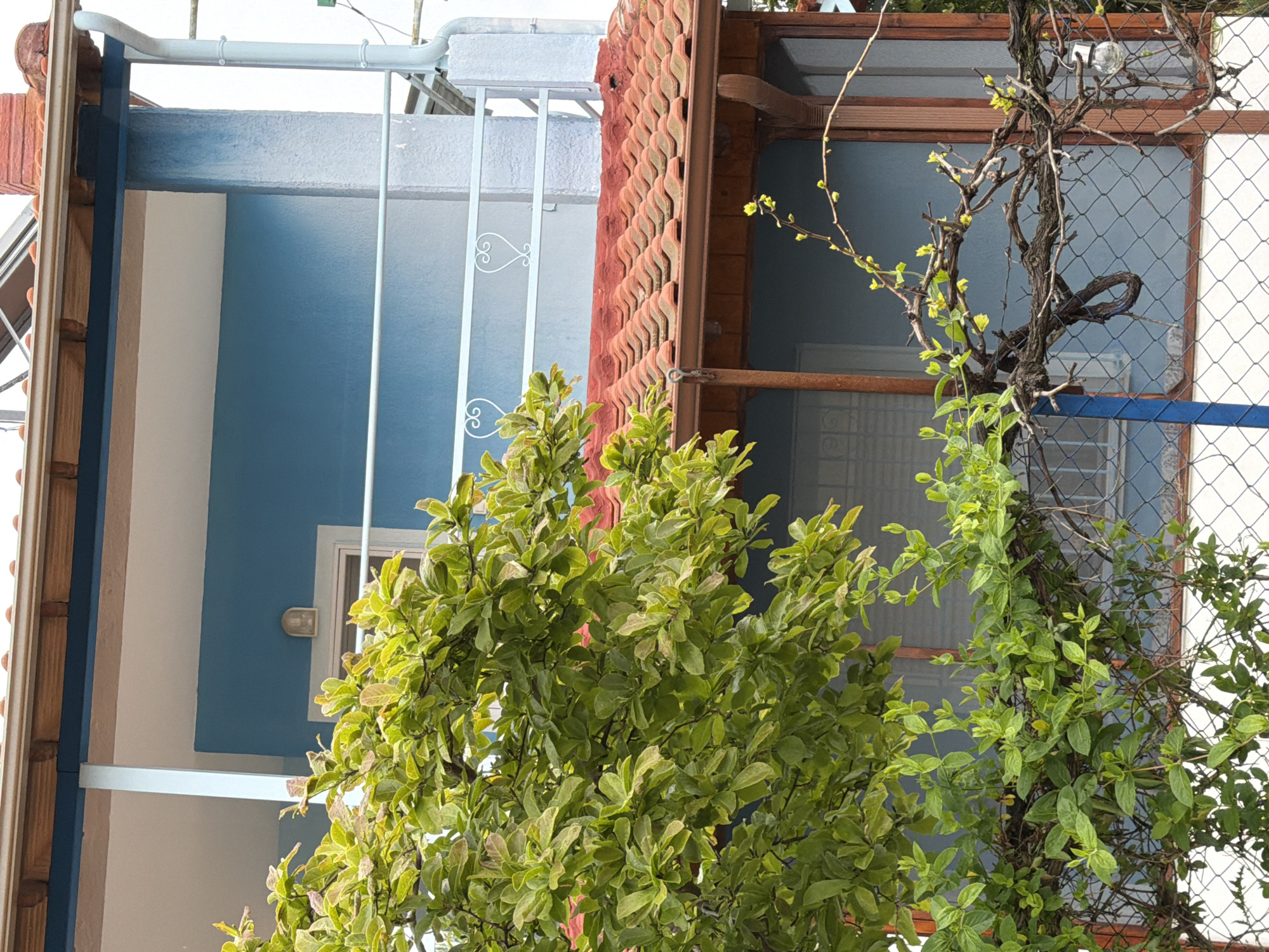 section of residential buildings in Megas Alexandros, Greece. The facades are painted in blue, white and grey with traditional terracotta tile roofing on one side. A window with a white frame is visible on the blue wall. Decorative white wrought iron details are present. A dense, leafy bush dominates the foreground obscuring portions of the buildings. A vine with delicate new leaves clings to a wire mesh on the building facade.