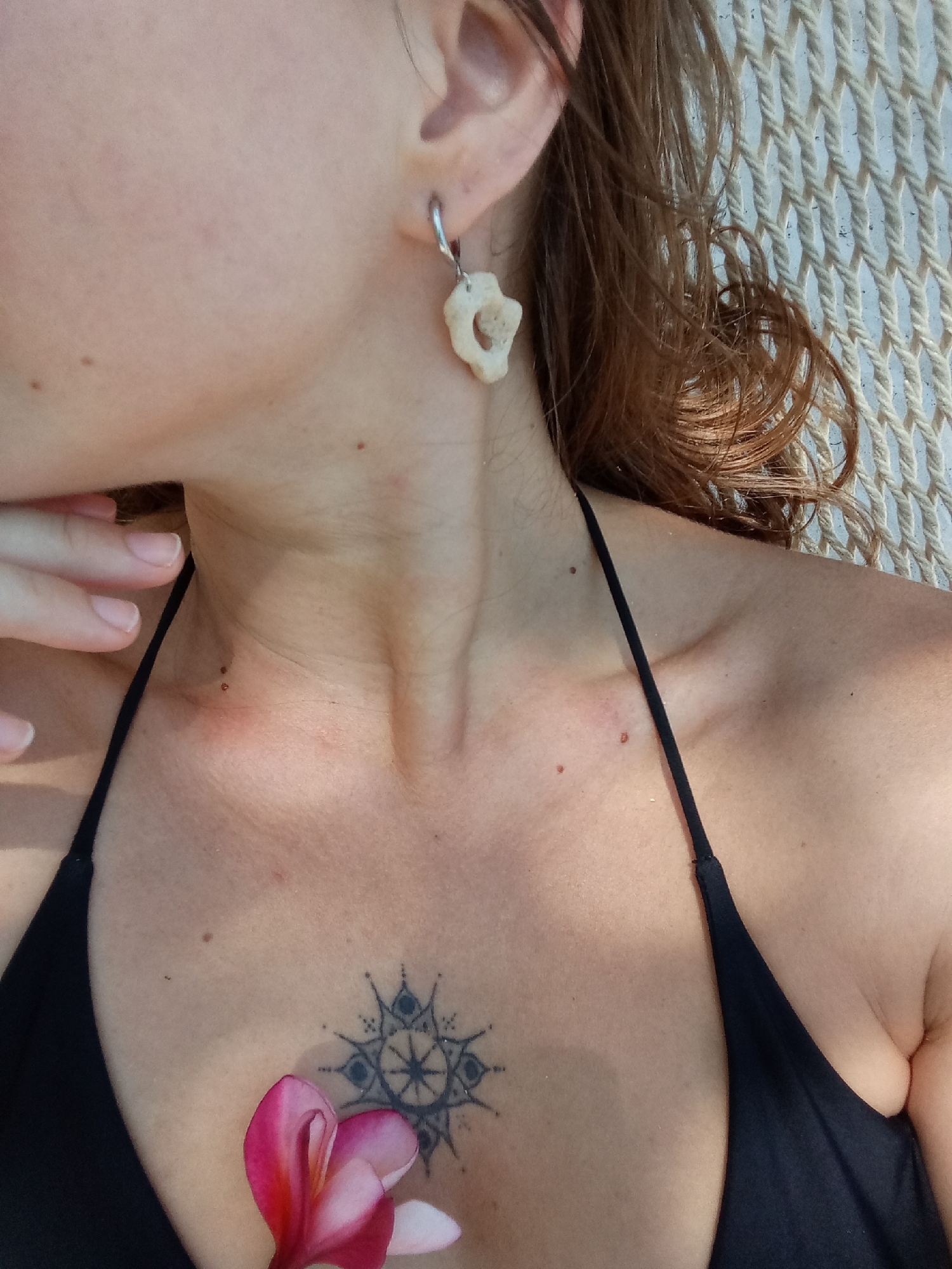 A woman lies in a net hammock, wearing a black swimsuit, with her head near the top of the frame. She has an earring in her left ear and a flower rests on her chest, near a tattoo. The background is a woven rope texture. There is no location in the city of Bac Natural Heritage Area Trang, Vietnam visible.