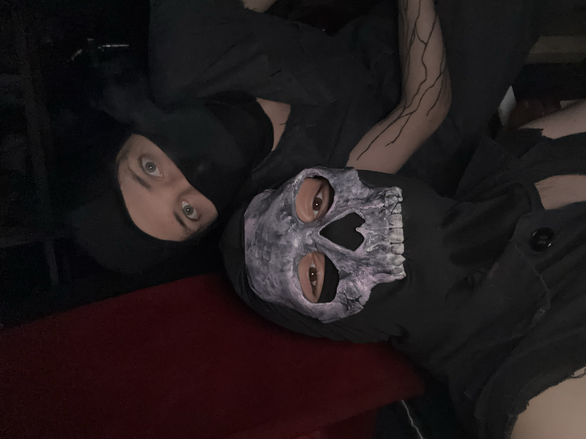 Two people are lying down indoors. The person on the left wears a black balaclava. The person on the right wears a skull mask. The location is unknown.