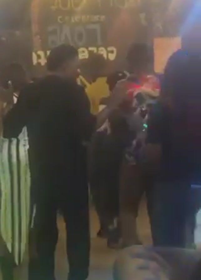 group of people dancing at what appears to be a party. The people are dressed in various styles. The lighting is a mix of artificial light and colored lights. There is a blurry sign in the background that appears to say "Celebrate Love". The camera moves around, capturing different angles of the scene, and people are dancing.