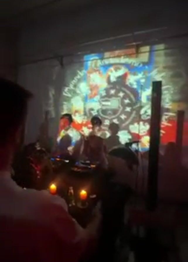 Two DJs, a woman with sunglasses and a man with a beard and a baseball cap, are performing at a party. Behind them is a projection with various images and designs. In front of them are lit candles and bottles on a table. People are standing and watching the performance. The environment is dimly lit.