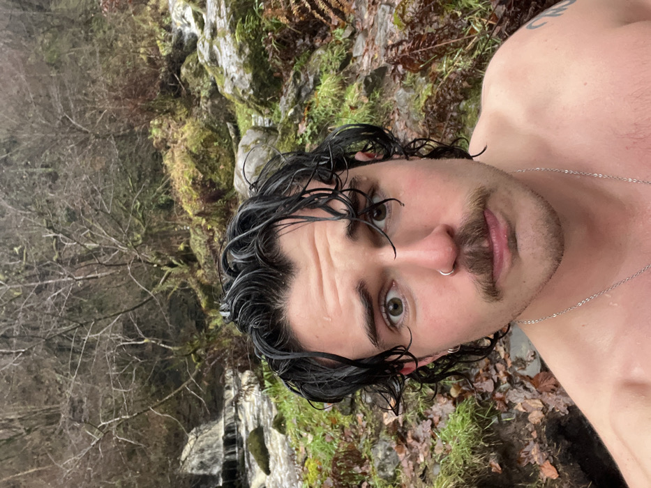 The image depicts a close-up portrait of a bare-chested male individual in a natural, outdoor environment. The subject has dark, wet, curly hair and a mustache, with a silver ring piercing his left nostril. He wears a thin silver chain necklace and a dark tattoo is partially visible on his left shoulder/upper arm. His eyes are wide, fixed directly on the camera with an open expression. The background reveals a rugged, natural landscape. To the left, a multi-tiered waterfall cascades into a rocky stream or river. The banks of the stream are covered in green moss, ferns, and scattered brown fallen leaves. The hillsides in the distance are densely forested with bare trees, indicating a temperate or cooler climate. The sky appears overcast, contributing to a muted, damp lighting condition. The scene suggests a wilderness setting rather than an urban area. Location: City of Unknown, Unknown.