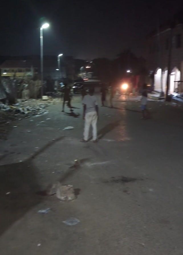 At night, a group of children are playing in a street littered with debris