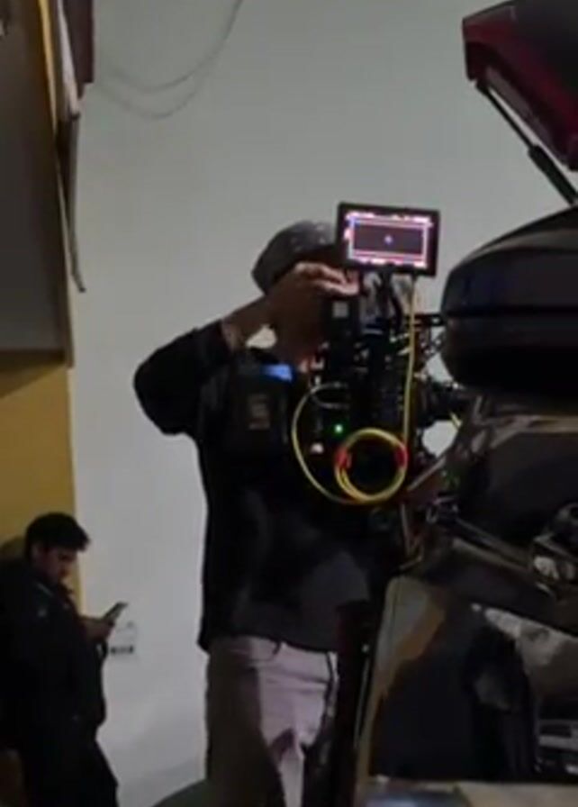 A person with a bandana adjusts a camera on a rig, next to a black car with its trunk open. A man in a black jacket and white sneakers looks at a smartphone while standing against a yellow wall in the background. The scene appears to be outdoors and dimly lit.