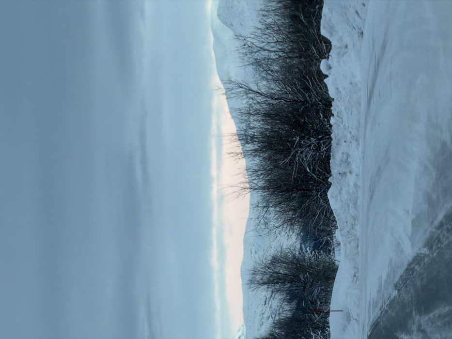 The image depicts a winter landscape in the city of Unknown, Norway. The scene features a snow-covered environment under an overcast sky that transitions from a light blue-grey at the top to a pale pinkish-orange band just above the horizon. In the background, large, snow-covered mountains rise. The mid-ground is dominated by a dense line of bare deciduous trees and bushes, dusted with snow. The foreground presents a snow and ice-covered road or track, exhibiting tire marks or smoothed areas, flanked by substantial snowbanks on both sides. A thin, red marker pole is partially visible on the left side of the road, behind a snowbank. No individuals, animals, or active vehicles are present in the image.