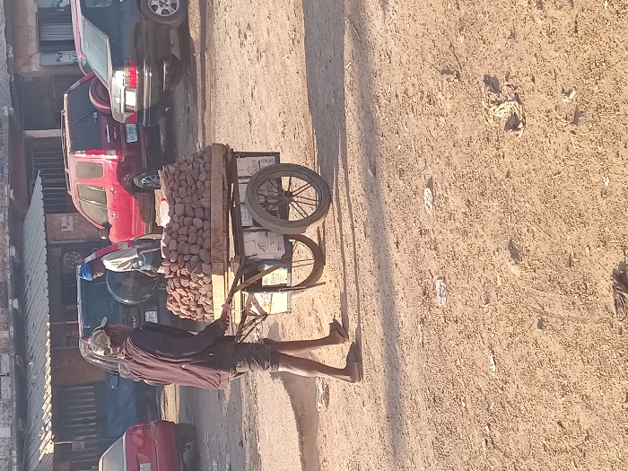 An individual pulls a two-wheeled cart laden with a substantial pile of brown rocks or tubers along a dirt or sandy road. The man, seen from the side, wears dark clothing and is barefoot. Cars are parked nearby, partially visible. Debris is scattered across the ground. The scene appears to be on a street in a populated area.