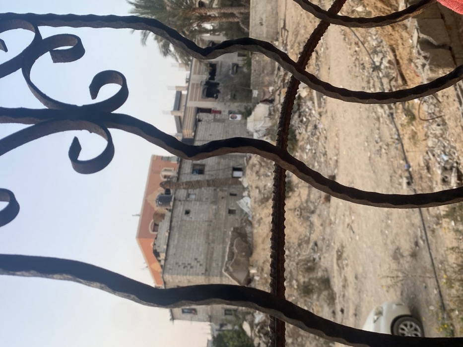The foreground is dominated by a rusted, ornate metal grille and a horizontal rebar element