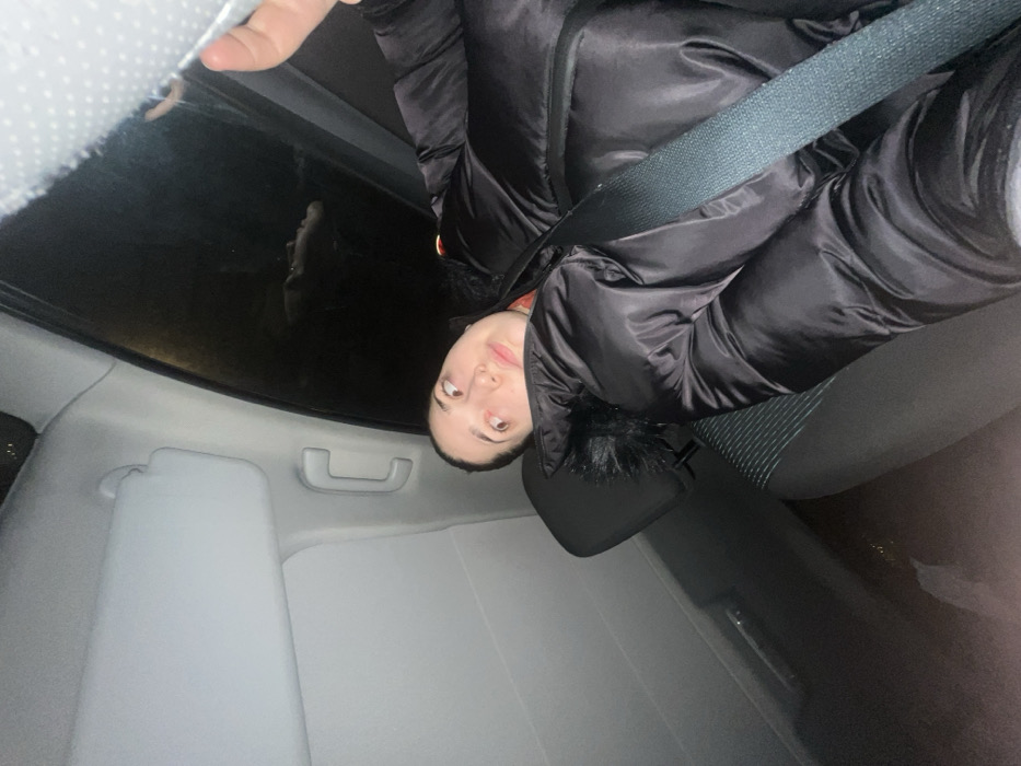 A person in a black puffer jacket is seated in a car. The interior is gray, and the car appears to be moving at night. A seatbelt is fastened across the jacket. The person is looking towards the camera with a neutral expression. The perspective is slightly angled. A portion of the car's ceiling and the outside night view are visible. The sun visor on the driver's side is down.