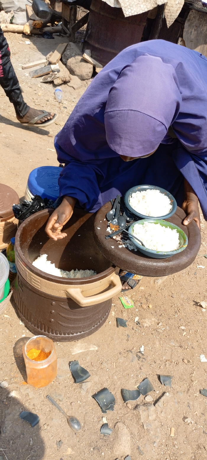 The image depicts a street-level scene in Jiru, Nigeria, focused on a food vending operation. A person, dressed in a purple hijab and matching long-sleeved garment, is bent over, with their right hand inside a large, brown, insulated food container. This container holds white rice. The person's left hand supports the container's brown, textured lid, on which two small bowls of white rice are placed. Multiple dark-colored spoons and some scattered food particles are also on the lid. To the left of the main subject, a partial view of another person's lower leg and foot is visible. This individual wears black pants with white lettering and grey flip-flops, standing on the dry, light brown ground. Behind them, a collection of construction debris including stones, wooden logs, and what appears to be corrugated metal or discarded building materials is present. A clear plastic water bottle lies on its side in the background. On the ground in the foreground, next to the large food container, a clear plastic jar with orange-red powder (likely spices) and a white lid is visible. A single silver-colored spoon lies near the jar. Several irregular fragments of dark plastic and a green and white packet are scattered across the dirt surface. A white plastic bucket with a blue lid is partially visible behind the main food container, along with another light-colored container. The immediate environment is dry and dusty.