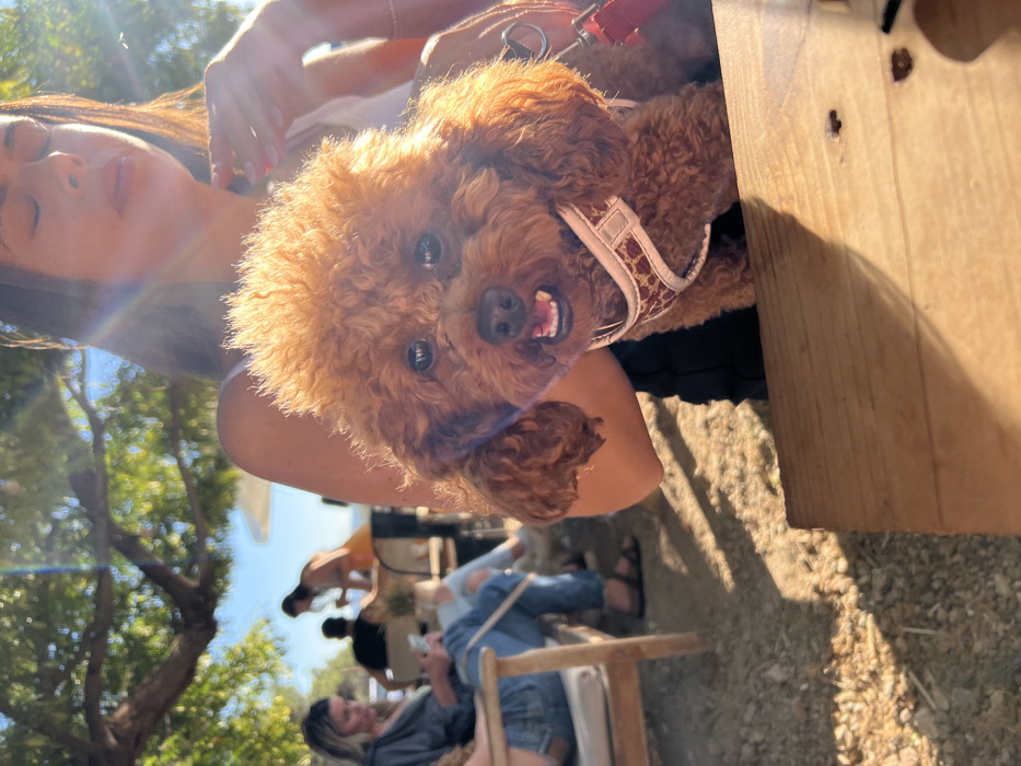 A forensic examination of the image reveals an outdoor scene in Kfar Ruth, Israel, likely a cafe or restaurant patio, captured under bright daylight. In the immediate foreground, a small, reddish-brown, curly-haired dog, resembling a Poodle or similar breed, is centered. The dog wears a white and brown patterned harness with a red leash attachment and displays a slightly open mouth, revealing small teeth. Its front paws appear to rest on a light-colored wooden table surface, which occupies the bottom right of the frame. Behind the dog, a female individual with long, dark hair is partially visible, holding the dog. She wears a light-colored top. Her face is brightly illuminated by direct sunlight, causing significant lens flare and obscuring clear facial details, though her eyes appear closed or squinting. Her right hand is near her face. In the middle ground, to the left, another female individual with blonde hair is seated in a wooden chair with a light cushion. She wears a dark top and blue jeans and appears to be looking down at a mobile device held in her lap. Her feet, clad in dark sandals, rest on the ground. Further in the background, obscured by foliage and other patrons, additional individuals are visible. One person in an orange garment is discernible. The ground consists of light-colored gravel or dirt, with distinct shadows cast by unseen objects and overhead trees. Green foliage from trees is visible in the upper and middle portions of the image, contributing to dappled sunlight on the ground and table. The sky is clear and blue.