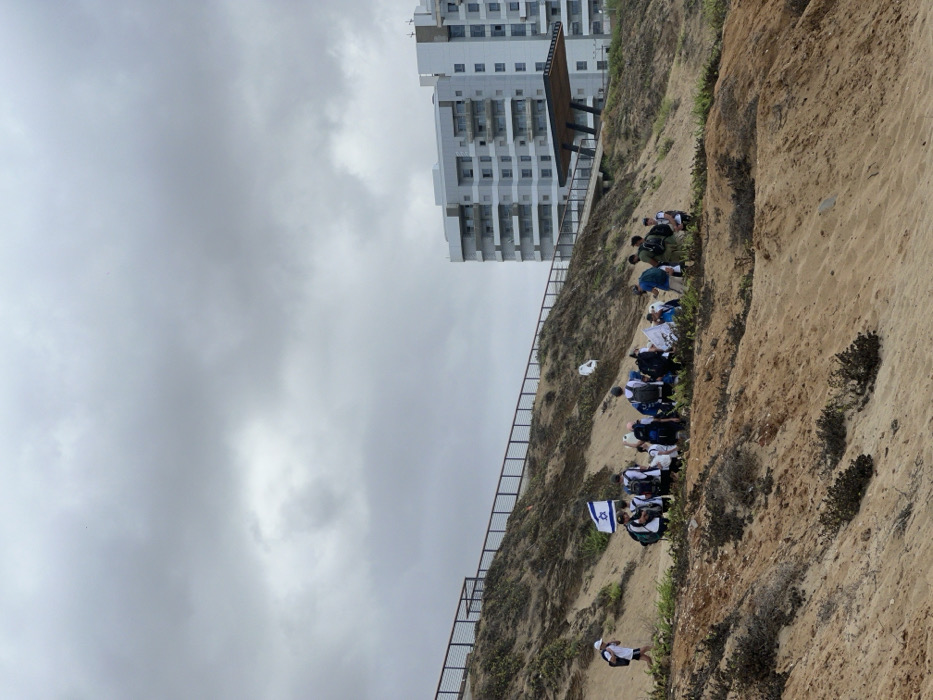 The image displays an outdoor scene under an overcast sky with dense grey clouds. In the foreground and midground, a sandy, undulating terrain indicative of a coastal dune or bluff is present, sparsely covered with low-lying green and brown vegetation. A group of approximately 12-15 individuals, predominantly young adults or teenagers, is clustered on this sandy slope. Most are dressed in casual clothing, including t-shirts and shorts/pants, and many wear backpacks, suggesting a hike or outing. One individual within the central group carries an Israeli flag on a pole, and another holds a white banner. To the far left, a lone individual in a white shirt and hat walks along a path. In the background, a modern, multi-story residential building with light-colored facades and numerous balconies stands prominently. Adjacent to the building and running along the crest of the sandy slope is a paved promenade, protected by a dark metal railing. A contemporary, open-sided structure with a dark, flat roof, likely a shelter or viewing platform, is situated on this promenade. A white plastic object, possibly litter, is snagged on the vegetation of the slope near the railing. The scene is located in a coastal area, city of Unknown, Unknown, marked by both natural sandy formations and modern urban development.
